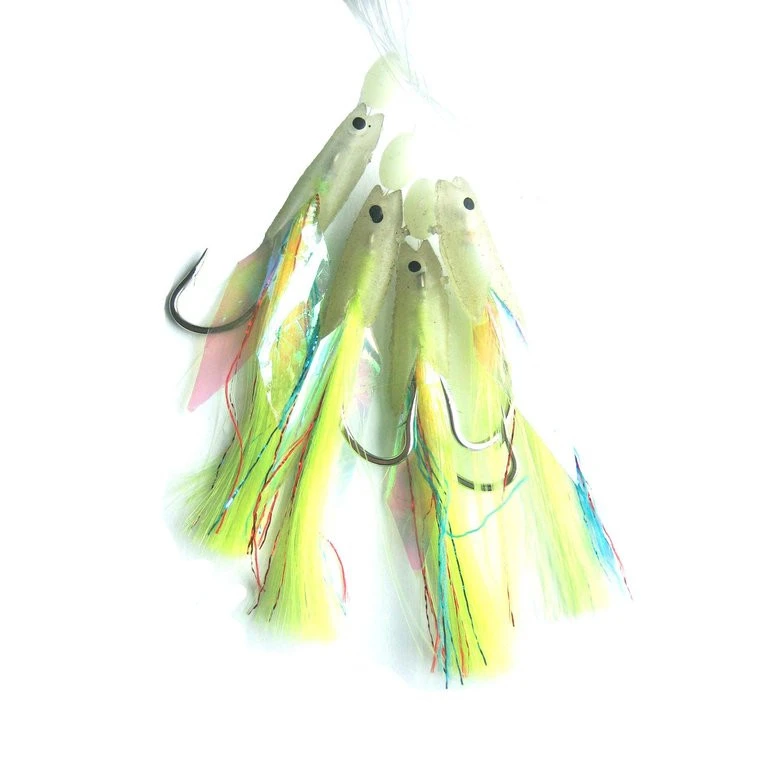Dieses handgebundene Vorfach, mit selbstleuchtenden Lockperlen und kleinen Fischimitationen mit Tinsel, ist 1,40m lang. Es besteht aus 0,45mm starker monofiler Schnur und Haken der Größe 3/0. Es gibt drei verschiedene Farbvarianten, die sich in der Farbe der Tinsel unterscheiden.