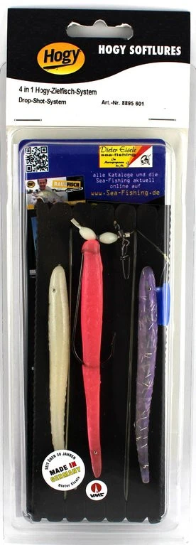 Diese ist ein Spezialsystem und wird mit einem Pilker oder Gundblei präsentiert. Die Hogy-Skinny’s schlängeln sich sehr verführerisch in der Strömung. Sie können die Skinny’s einfach austauschen, das hängt natürlich vom Beißverhalten der Fische und den entsprechenden Lichtverhältnissen ab. Befestigt werden die Skinny’s an einem VMC-Offset-Haken. In einer Packung sind jeweils 3 verschiedenfarbige Skinny’s enthalten. Die Farben der Skinny’s sind Bubble Gum, Bally Smoke und Bone.