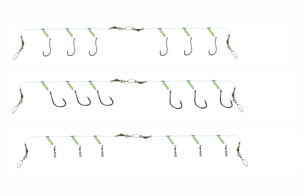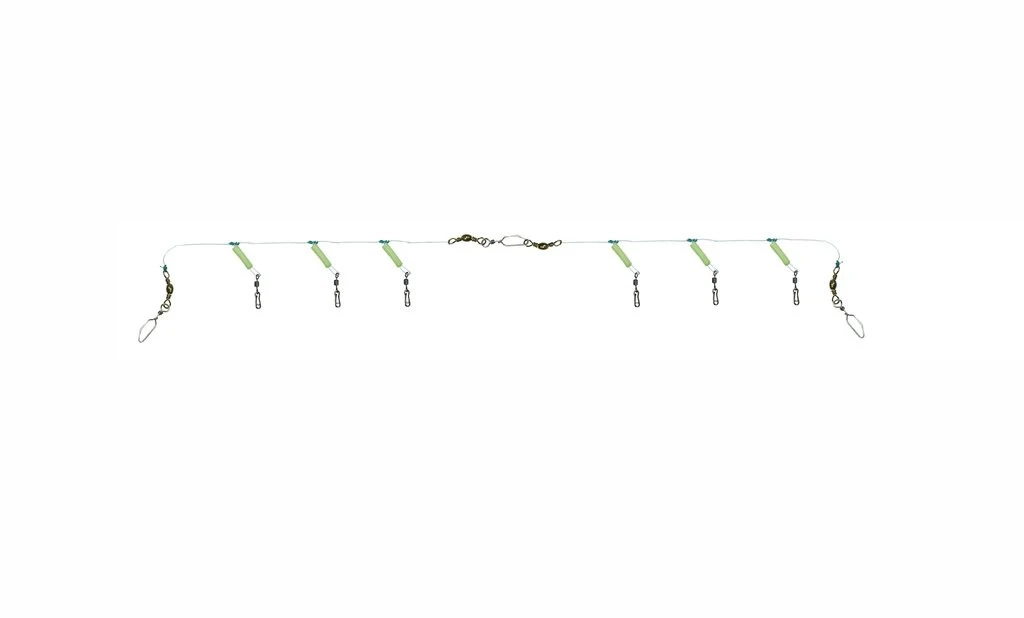 Diese Vorfächer sind speziell für den Fang von Rotbarschen konzipiert worden. Es gibt drei Versionen, zwei mit Haken und eine mit Patent Snap-Swivel. Die Haken sind im Abstand von 80cm angebracht. Die Gesamtlänge des Vorfaches beträgt 640cm. Somit kann über eine große Strecke die Wassersäule nach diesen Fischen effizient abgesucht werden. Die Vorfächer besitzen vor den Haken bzw. Wirbeln ein Stück Leuchtschlauch, um den Rotbarsch anzulocken. Es gibt diese Vorfächer mit Circle-Hook oder roten Meereshaken der Größe 3/0. Die dritte Variante bestitzt die Patent-Snap-Swivel. Dies ist von Vorteil, um flexibel auf die Gegebenheit vor Ort reagieren zu können. In diese Schnellwechselwirbel können dann individuell eigene Haken schnell befestigt werden. Bei dieser Variante lassen die Wirbel den Haken frei schweben und wackeln. Da das Vorfach 640cm lang ist, werden die Fische mit der Hand angelandet. Dafür beinhaltet das Vorfach eine Relingaufnahme für die abgehakten Haken.