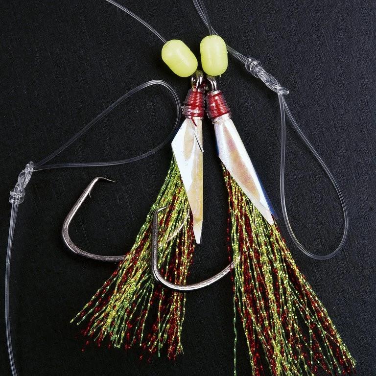 Das Vorfach besteht aus zwei Dorschfliegen mit Haken der Größe 8/0. Die Dorschfliegen haben grün-rote Federn und sind an einer 0,60mm starken Hauptschnur befestigt.