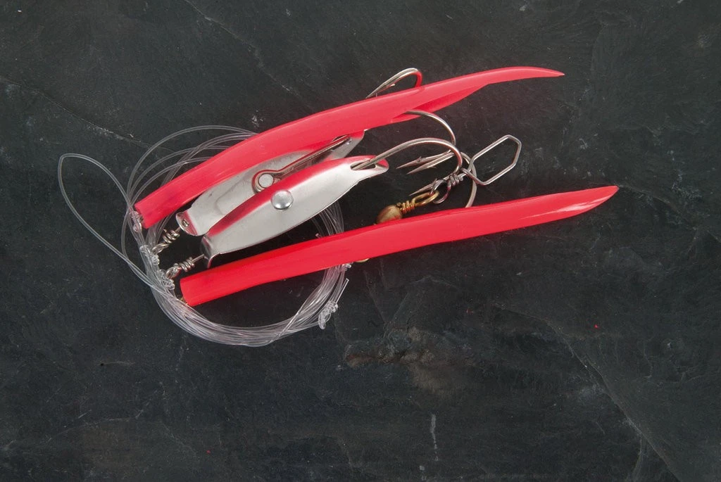 Dieses Pilkvorfach besteht aus zwei roten Gummi-Makks und und zwei Makrelen-Blinkern. Die Hakengröße beträgt 4/0.